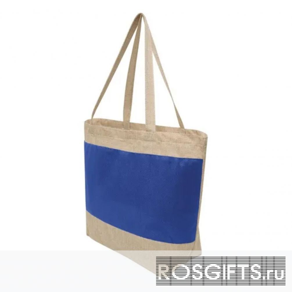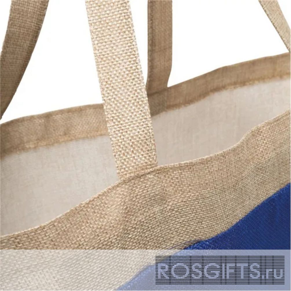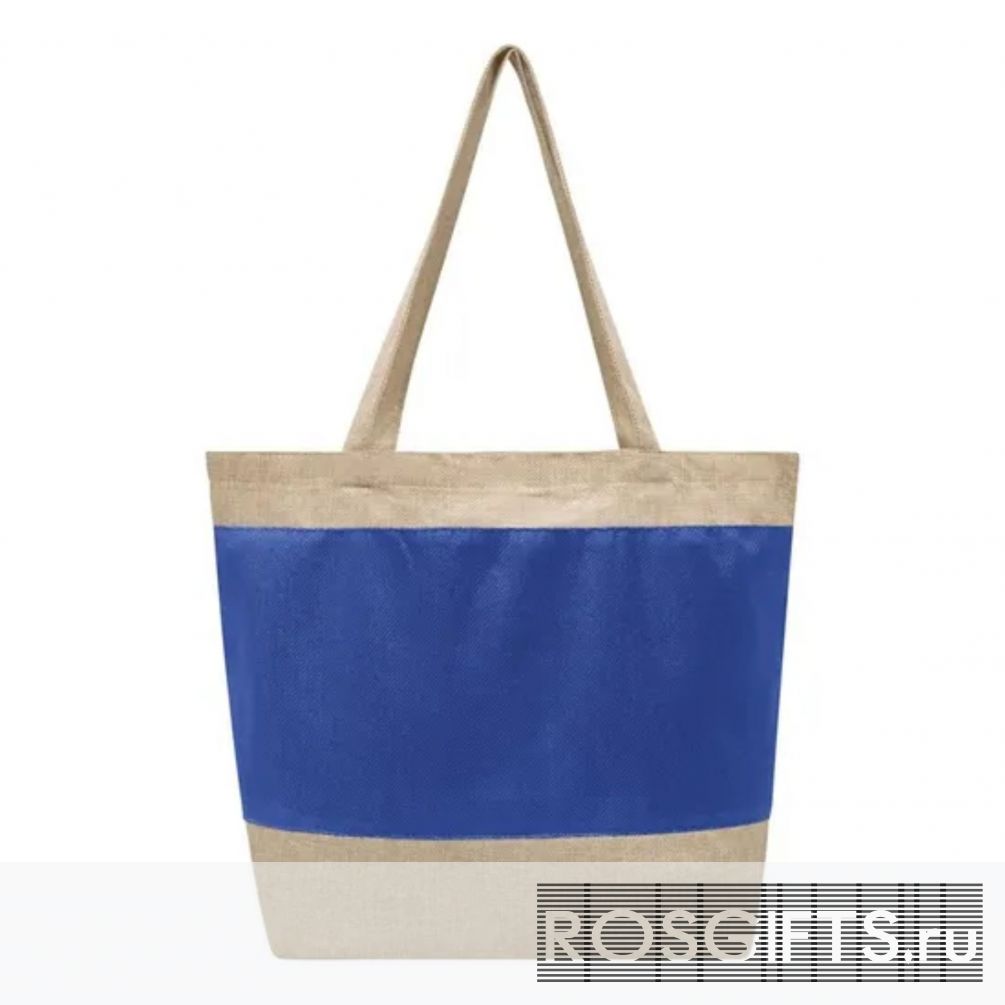 Вместительная сумка-шопер из полиэстера под фактуру джута с 2 длинными ручками. Лицевая сторона сумки с синей вставкой. Если не подходят сроки поставки или партия заказа выберите СУМКИ ИЗ НАЛИЧИЯ