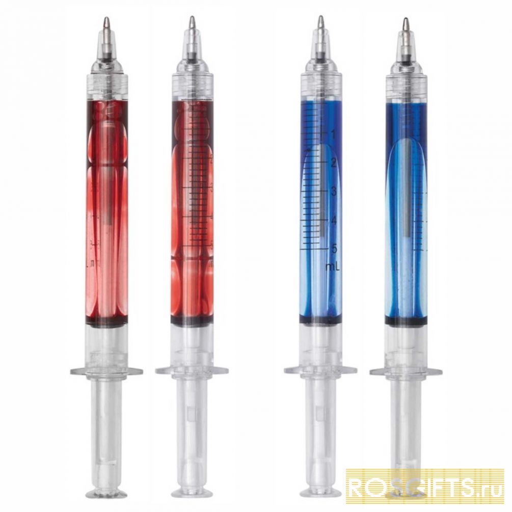Шариковые ручки в виде шприца с жидкостью красного или синего цвета. В ручках установлены стержни с синей пастой. Оформить заказ на ручки в виде шприца можно от 5000 штук.