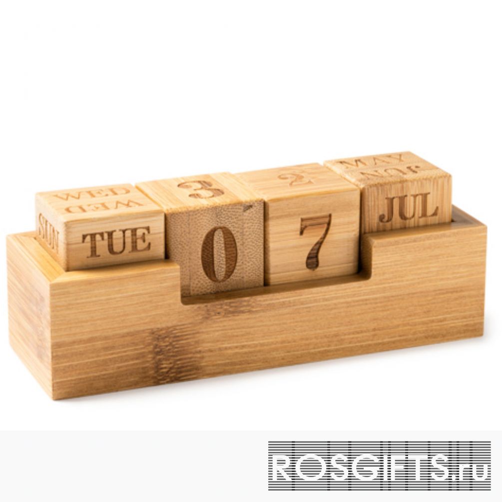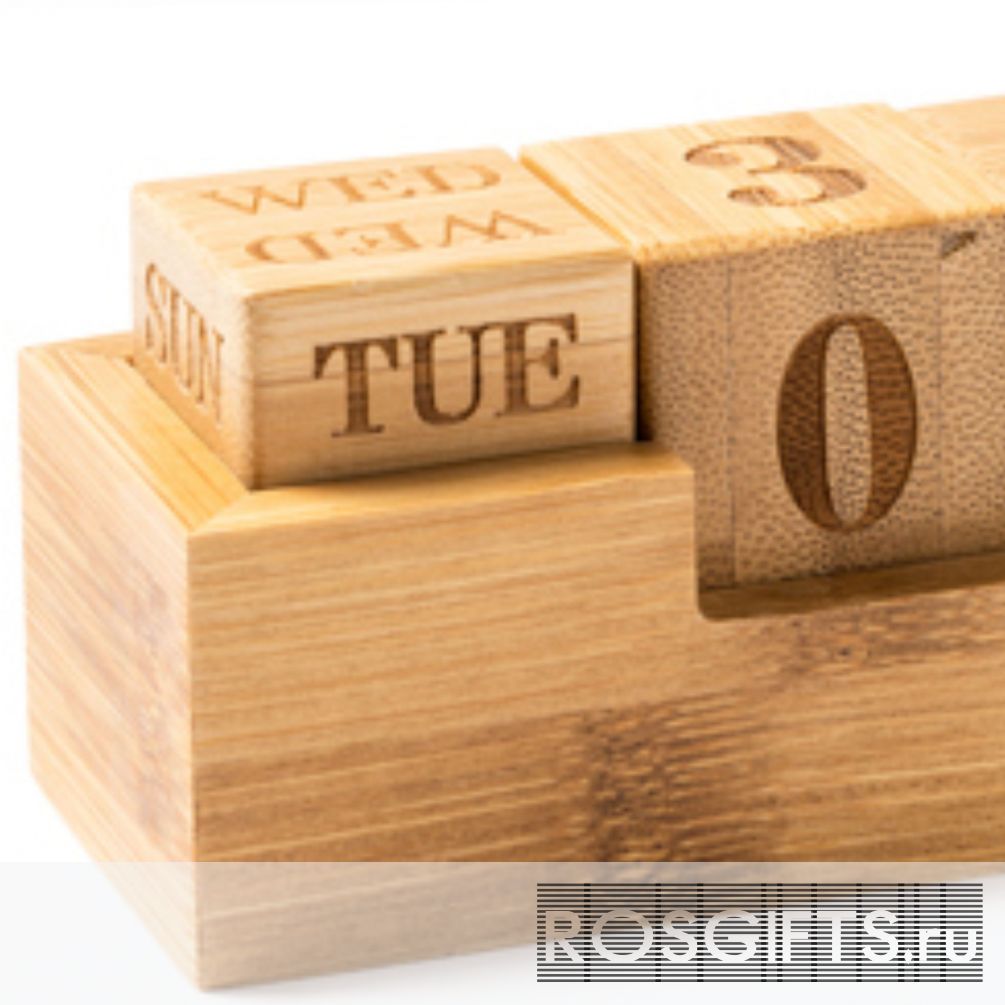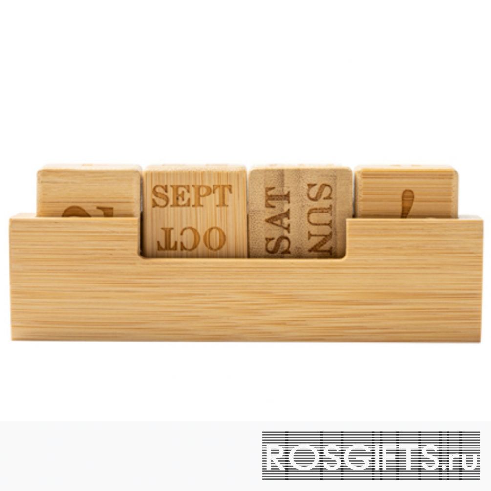 Компактный вечный настольный календарь Medus изготовленный из бамбука, который состоит из одной подставки и четырех гравированных блоков с числами и днями недели (на английском). Нанесение можно делать на подставке.