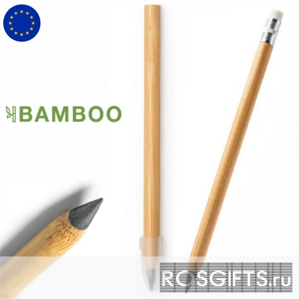 Вечные карандаши в корпусе из бамбука, на котором можно сделать нанесение логотипа или надписи гравировкой или тампопечать (если нужно цветное нанесение). Специальный свинцовый грифель для бесконечного письма который не требует заточки. Минимальный заказ от 2000 штук. Привезем под заказ в интервале 6-8 недель, если нет времени ждать поставку то ВЫБЕРИТЕ ЭКО КАРАНДАШИ ИЗ НАЛИЧИЯ