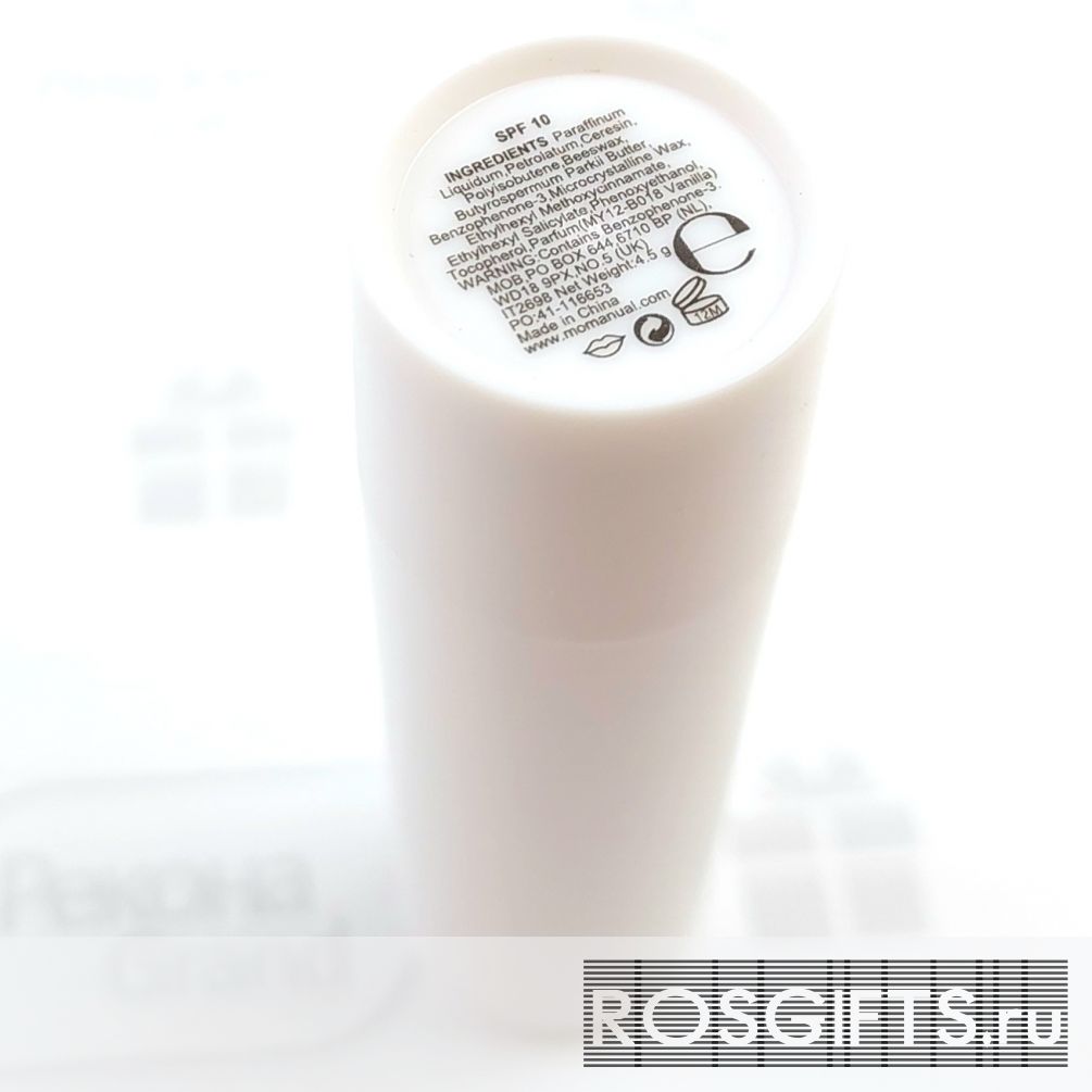 Состав - Paraffinum Liquidum, Petrolatum, Ceresin, Beeswax, Butyrospermum Parkii Butter, Polyisobutene, Microcrystalline Wax, Ethylhexyl Salicylate, Benzophenone-3, Ethylhexyl Methoxycinnamate, Phenoxyethanol, Tocopherol, Parfum (VANILLA MY12-B018).Состав помады напечатан на донышке. Индивидуальная упаковка отсутствует - прозрачные ПЭТ пакеты можно заказать отдельно + 3 р/шт а при заказе помад с печатью упаковка и расфасовка бонусом. Область персонализации на колпачке и на основании.