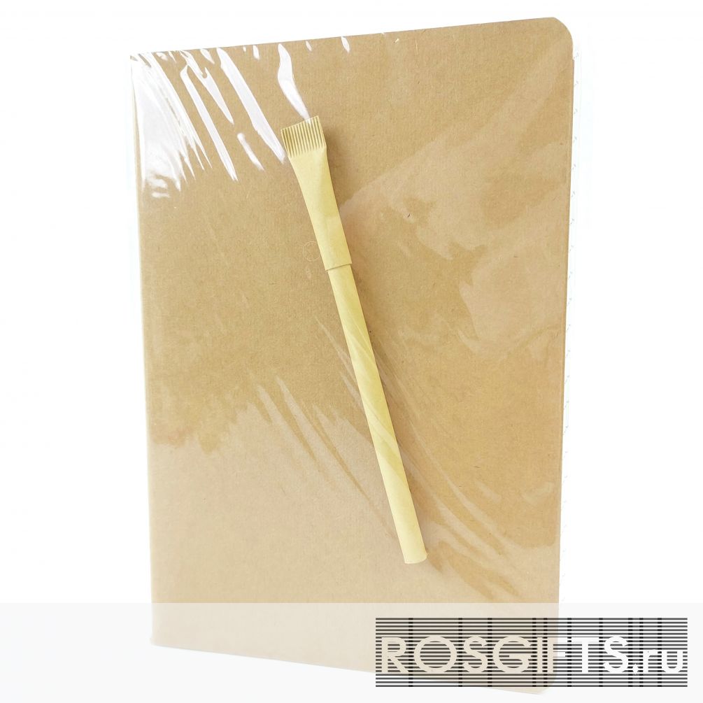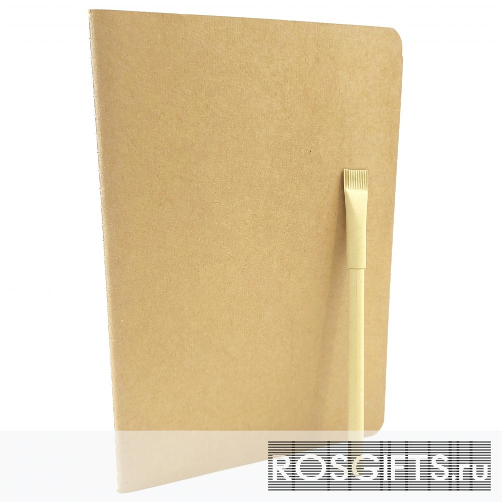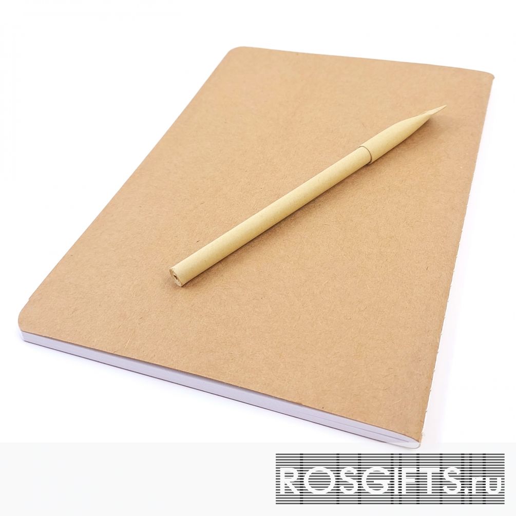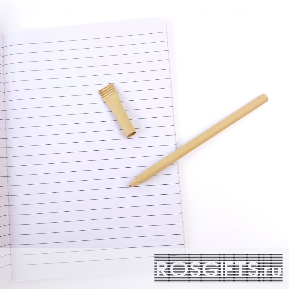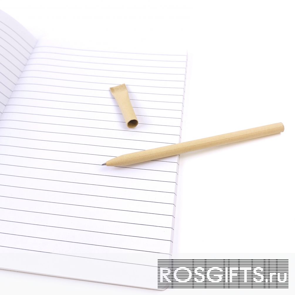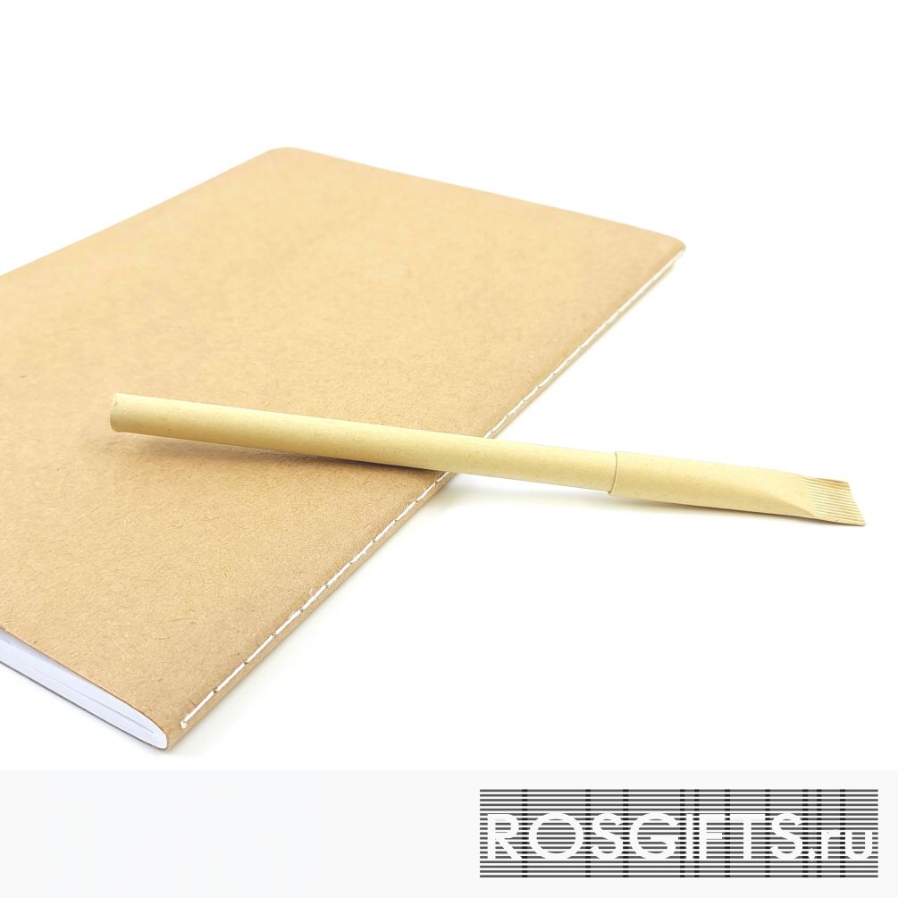 Недорогой набор состоит из эко ручки из переработанного картона и эко блокнота формата А5 с обложкой из плотной крафт обложки. Линованный блок 60 страниц.