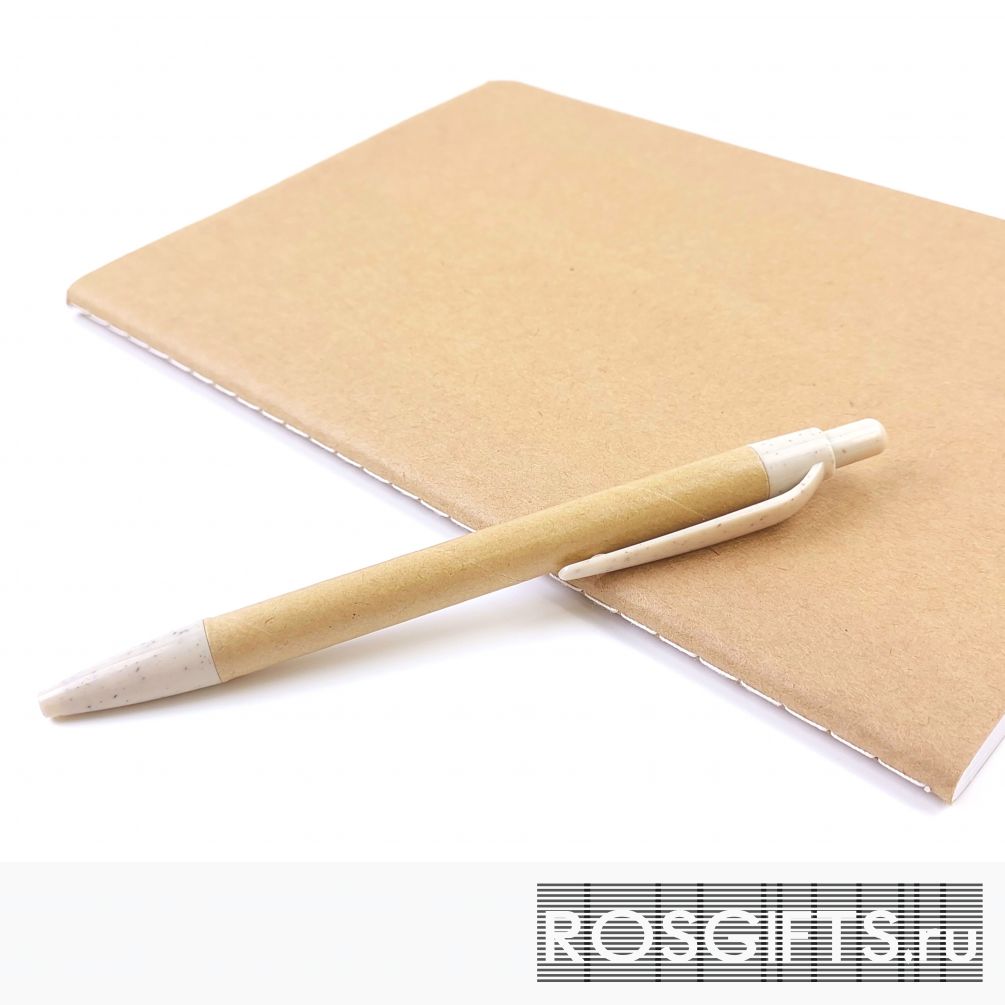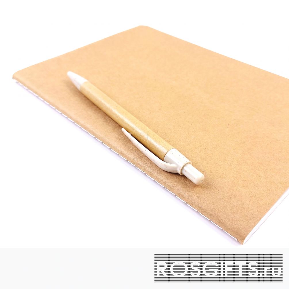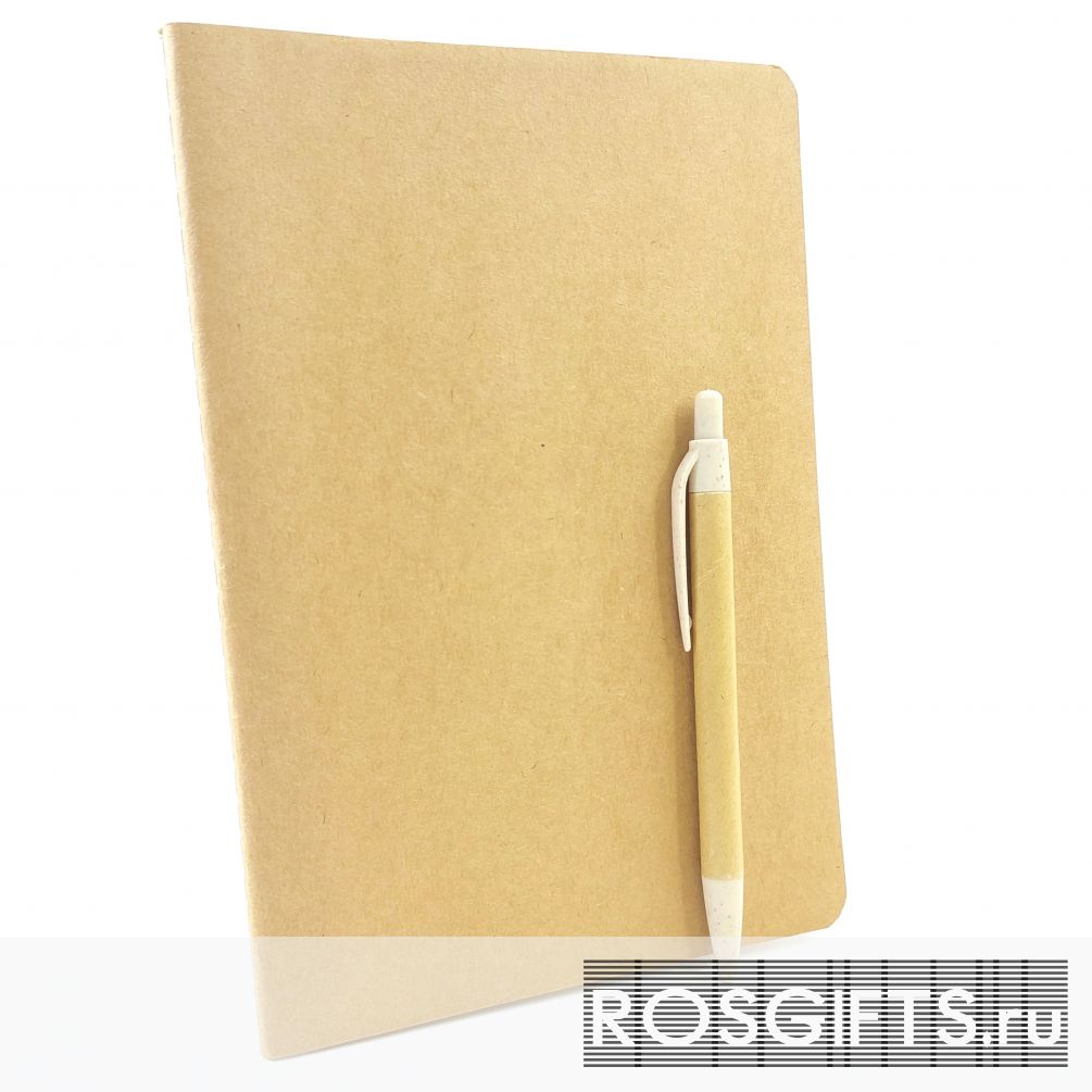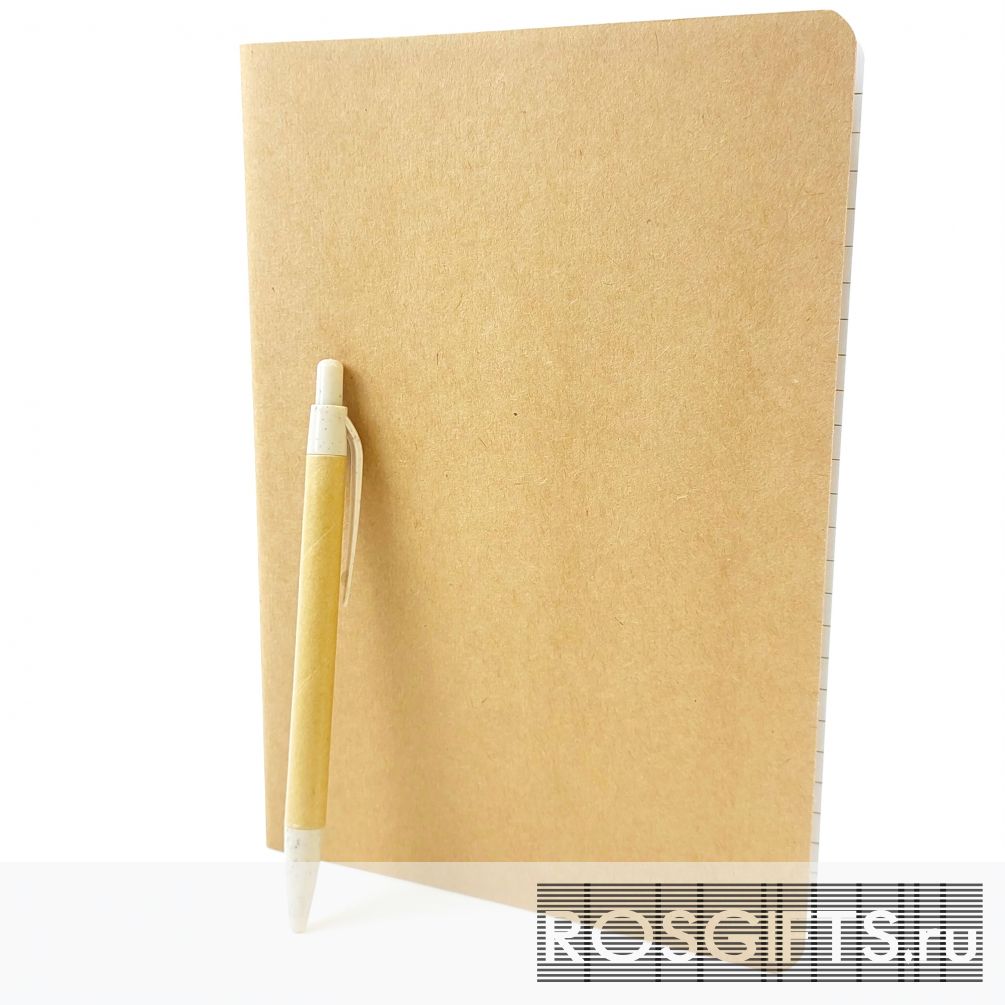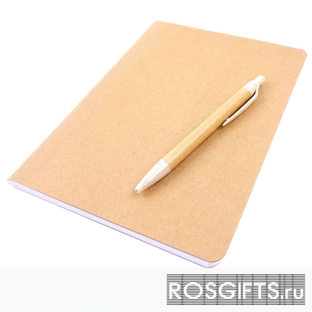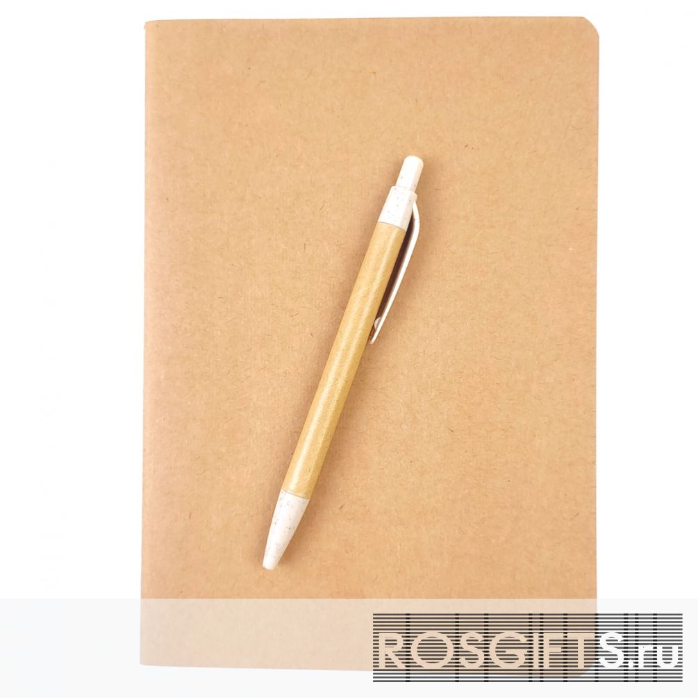 Недорогой набор состоит из эко ручки из переработанного картона и эко блокнота формата А5 с обложкой из плотной крафт обложки. Линованный блок 60 страниц.