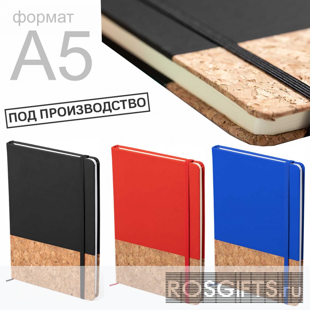 Блокнот в твердом переплете с обложкой из пробки и цветного пвх. Блок кремовая бумага 80 листов/160 страниц. Минимальный заказ на один цвет 500 штук.