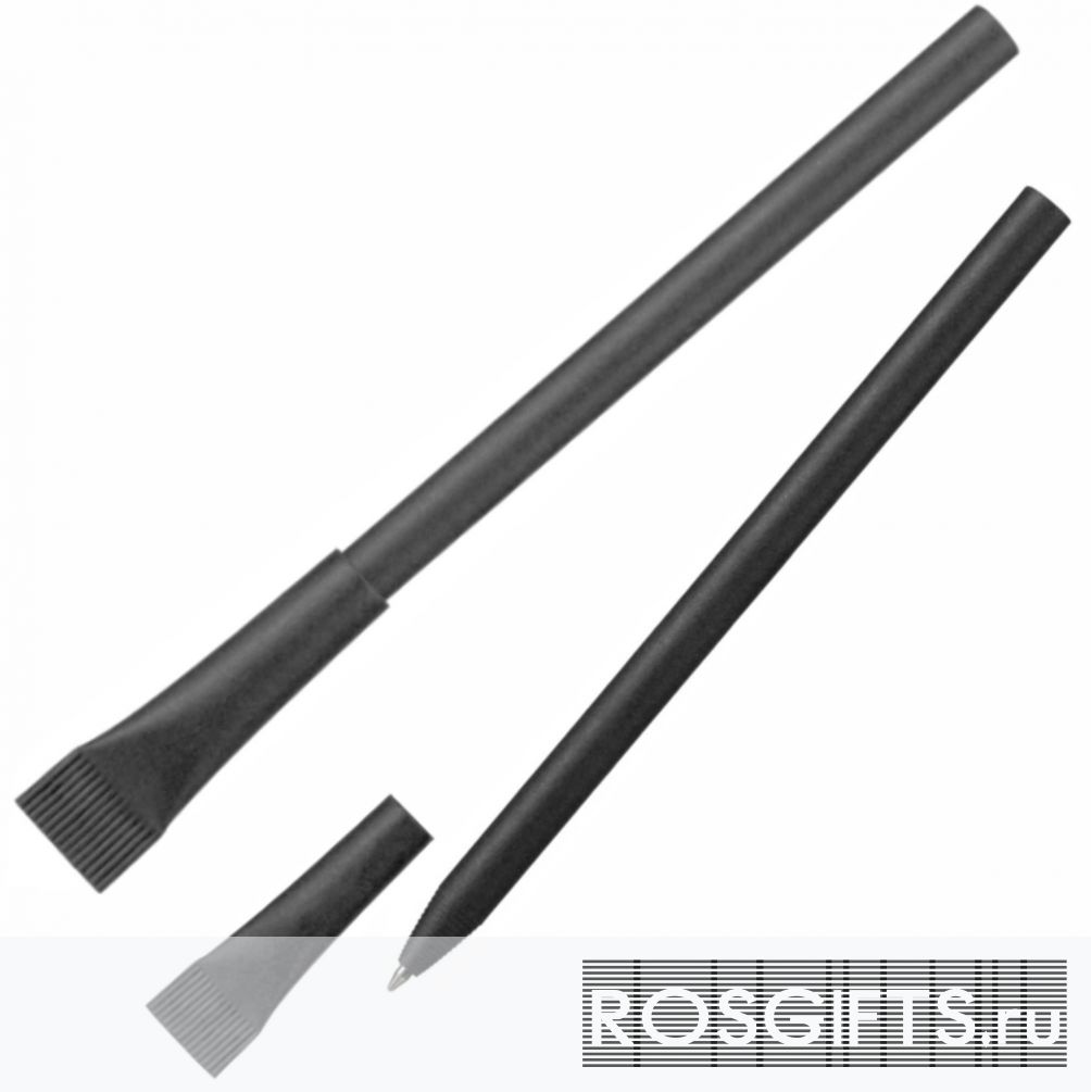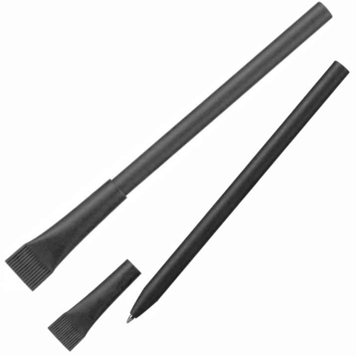 Черного цвета шариковая ручка с колпачком. Корпус и колпачок изготовлены из переработанной бумаги. Хорошие стержни с ресурсом до 1000 метров письма. Возможности нанесения символики тампопечать как на корпусе так и на колпачке - область нанесения указана в шаблоне для макетов. Оформить заказ на бумажные ручки натурального цвета можно от 1000 штук.
