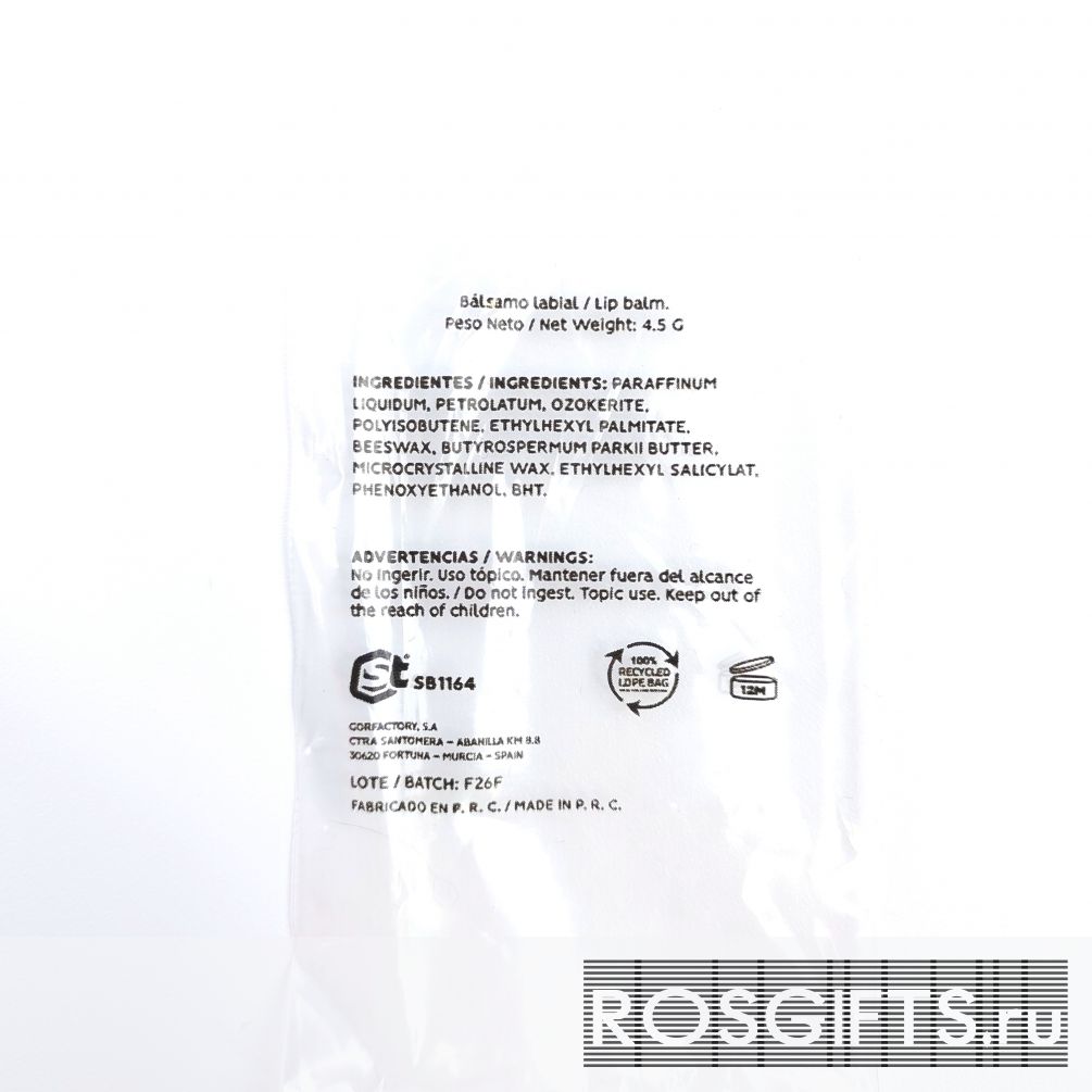 Состав Paraffinum Liquidum, Petrolatum, Ceresin, Polyisobutene, Beeswax, Butyrospermum Parkii Butter, Benzophenone-3, Microcrystalline Wax, Ethylhexyl Methoxycinnamate, Ethylhexyl Salicylate, Phenoxyethanol, Tocopherol, Parfum Vanila), Benzyl benzoate. Внутренняя часть корпуса из пищевого пластика. Индивидуальная упаковка - прозрачный ПЭТ-пакет из переработанного пластика с указанием состава на английском.