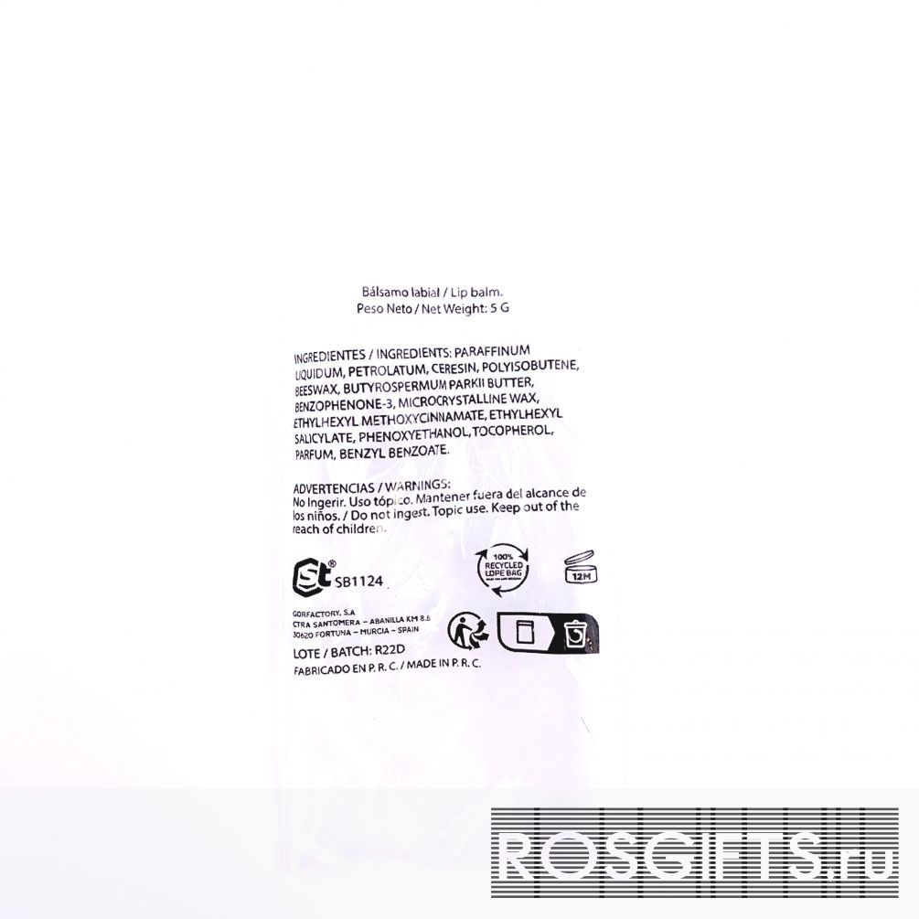 Состав - Paraffinum Liquidum, Petrolatum, Ceresin, Polyisobutene, Beeswax, Butyrospermum Parkii Butter, Benzophenone-3, Microcrystalline Wax, Ethylhexyl Methoxycinnamate, Ethylhexyl Salicylate, Phenoxyethanol, Tocopherol, Benzyl benzoate, Parfum Vanila. Состав размещен на индивидуальном ПЭТ пакете.
