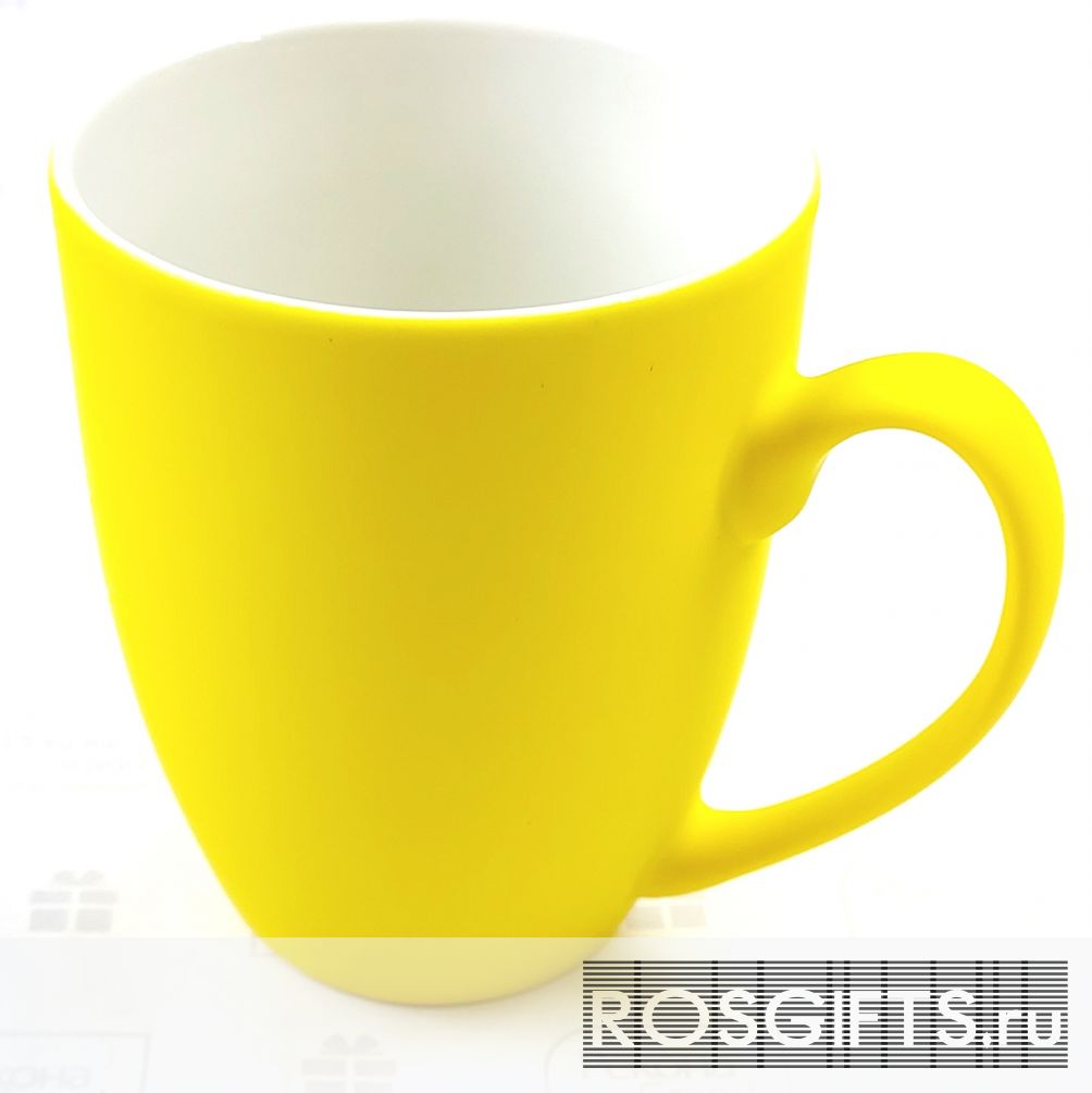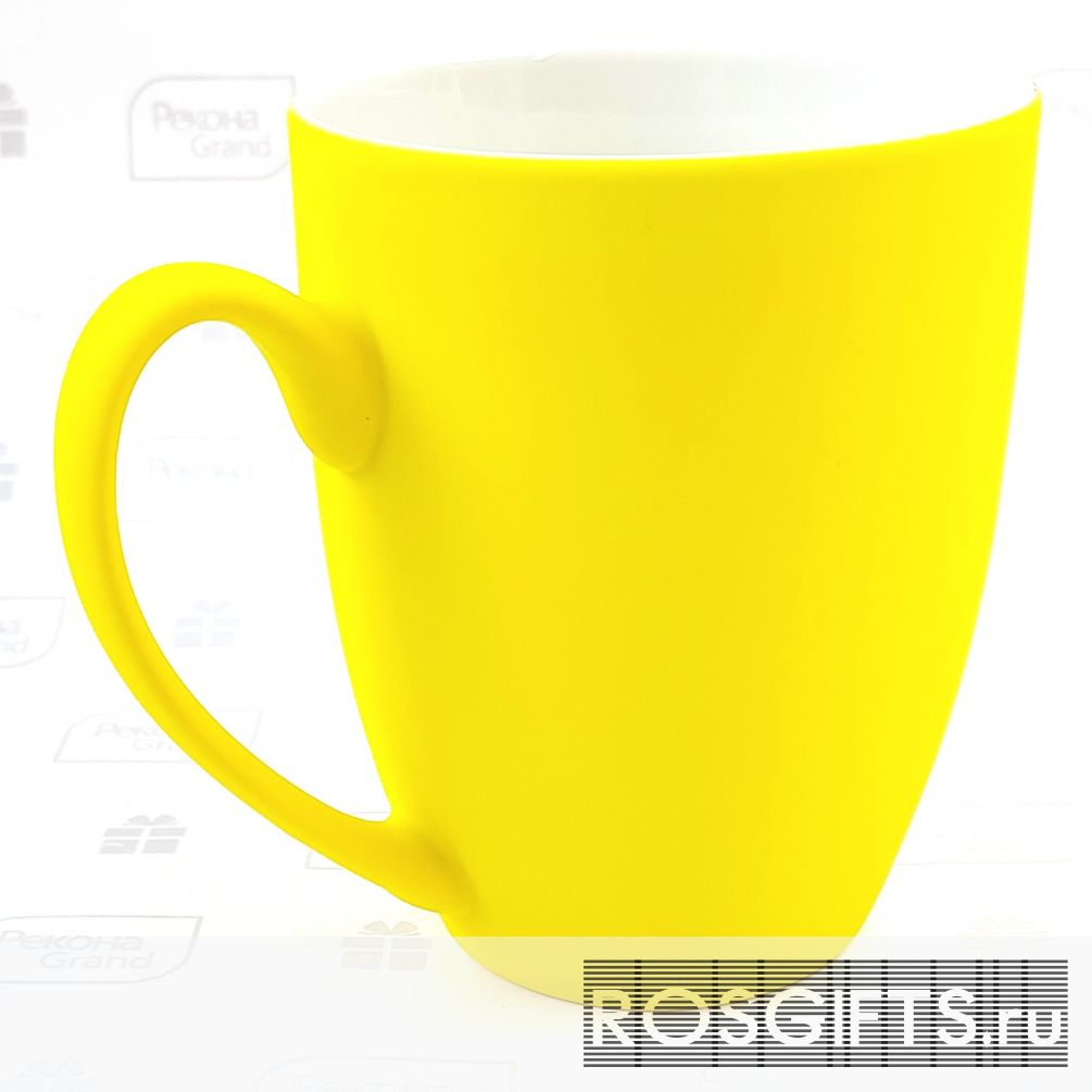 Желтого цвета фарфоровые кружки с покрытием soft touch. Удобный объём 350 мл делает её удобной для дома или для офиса. Можно делать персонализацию - область нанесения в шаблоне для макетов. Оптовый заказ от 100 штук.