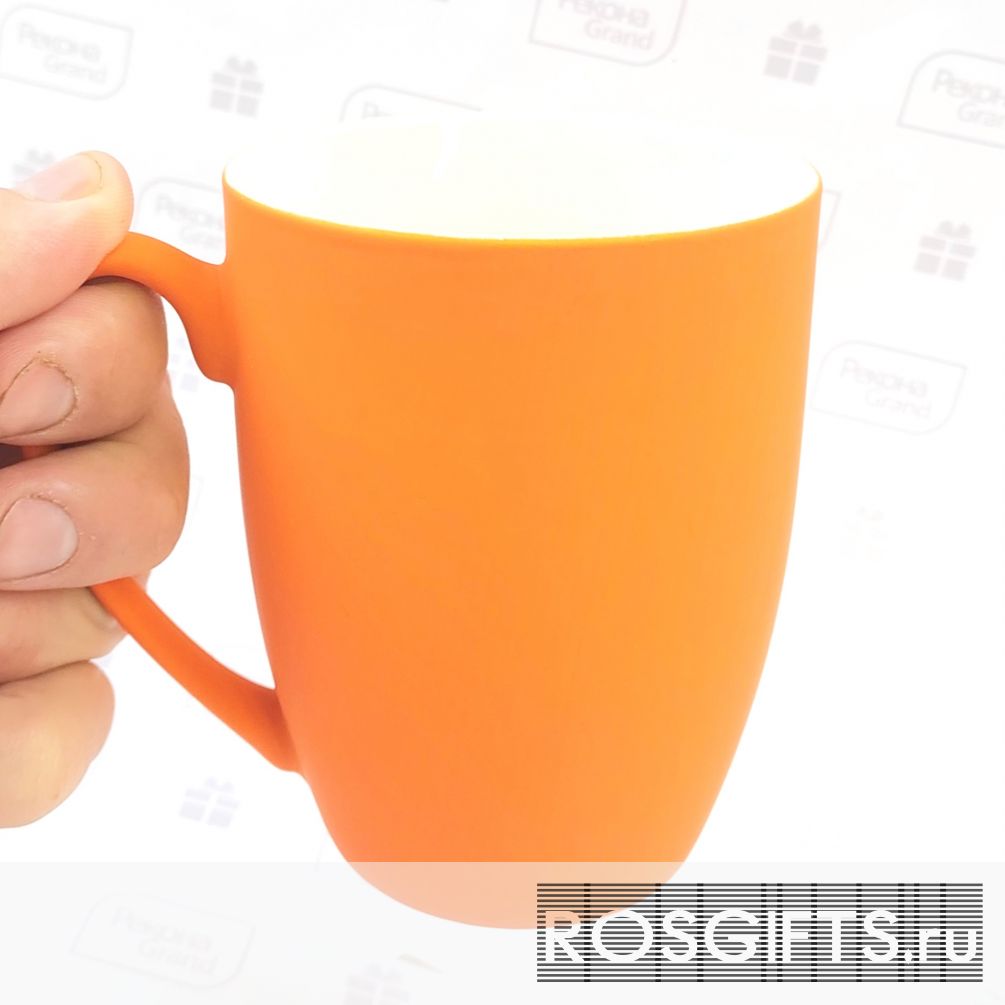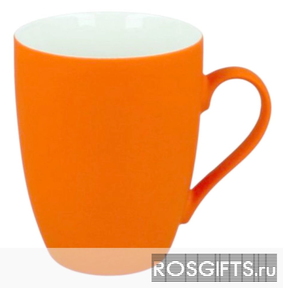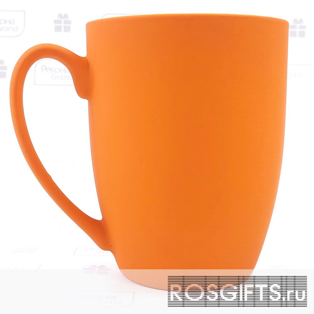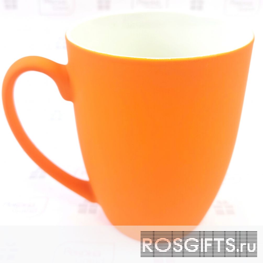 Оранжевого цвета фарфоровые кружки с покрытием soft touch. Удобный объём 350 мл делает её удобной для дома или для офиса. Можно делать персонализацию - область нанесения в шаблоне для макетов. Оптовый заказ от 100 штук.
