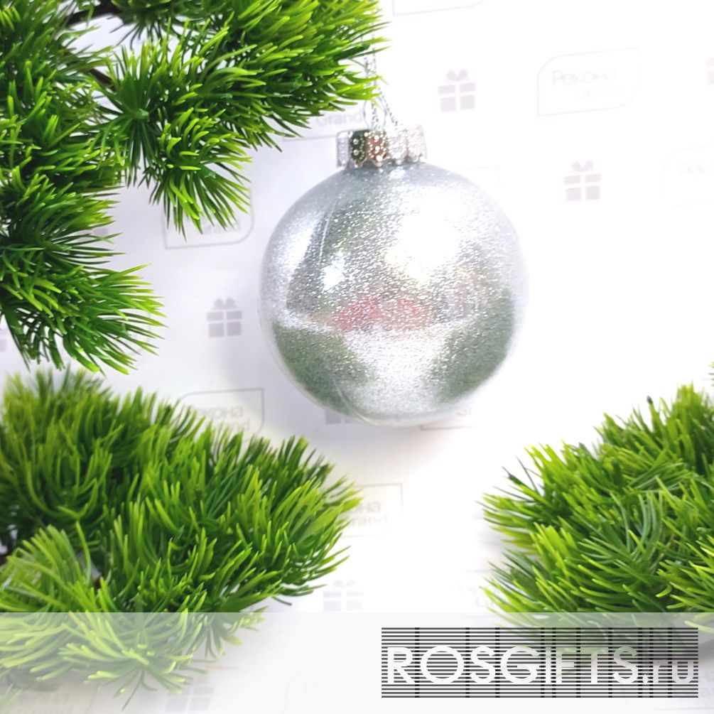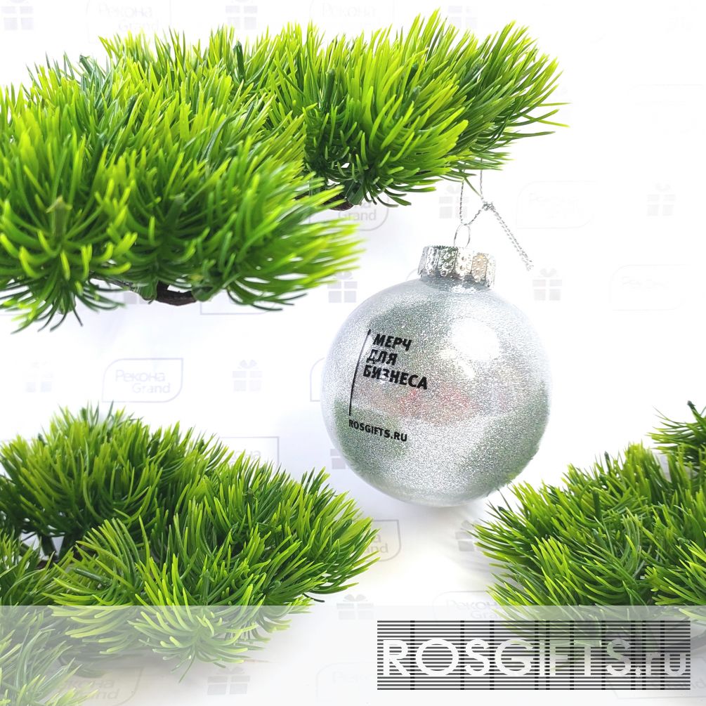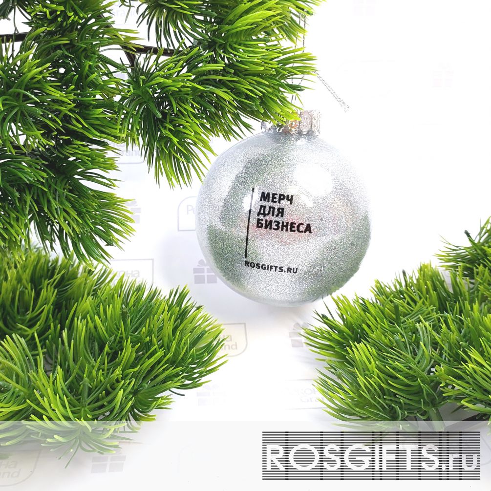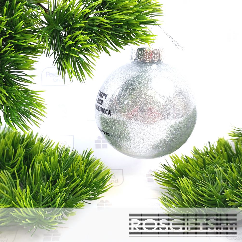 Это шар станет настоящим украшением елки. Изготовлен из небьющегося пластика с праздничным дизайном - изнутри весь покрыт блестками. Наиболее распространенный размер - 8 см, область печати 25 мм в диаметре.