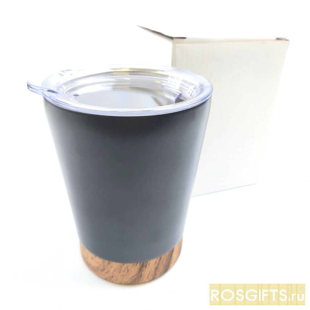 Стильная термокружка с черным матовым корпусом и декоративной вставкой с имитацией фактуры дерева soft-touch. Двойные стенки из стали сохранят напиток горячим до 3х часов. Высота без крышки 11.4 см, подходит для большинства кофемашин.