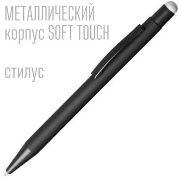 Шариковая ручка из металла с поверхностью soft-touch черного цвета, серебристый стилус для работы с сенсорными экранами. Нажимной механизм подачи стержня, сменный стержень. На корпусе ручки можно сделать нанесение гравировкой и уф-печатью.