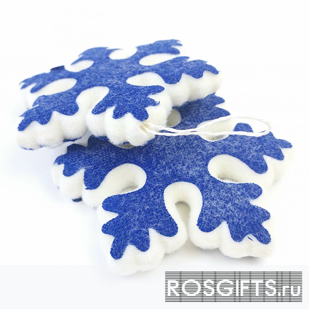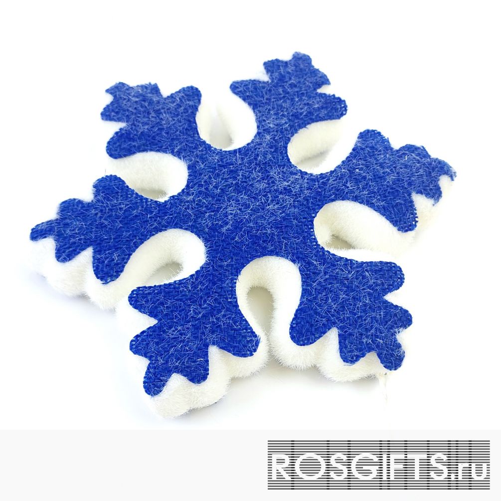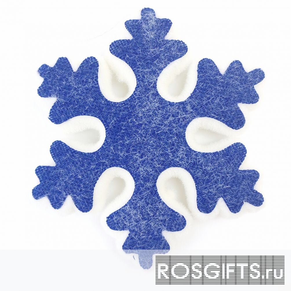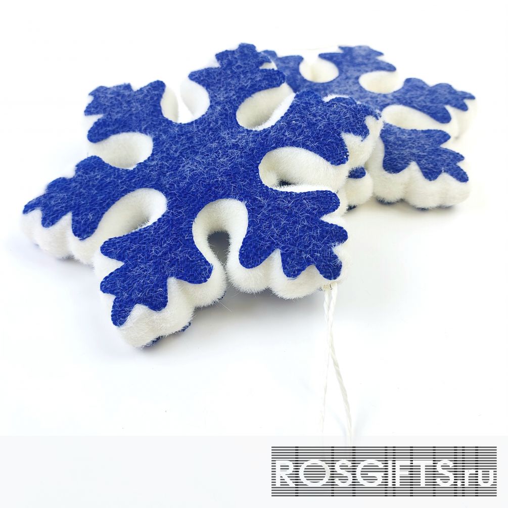 Необычное праздничное новогоднее украшение в виде снежинки синего цвета с белым обрамлением. Такая снежинка будет прекрасным дополнением подарочного набора к новому году.