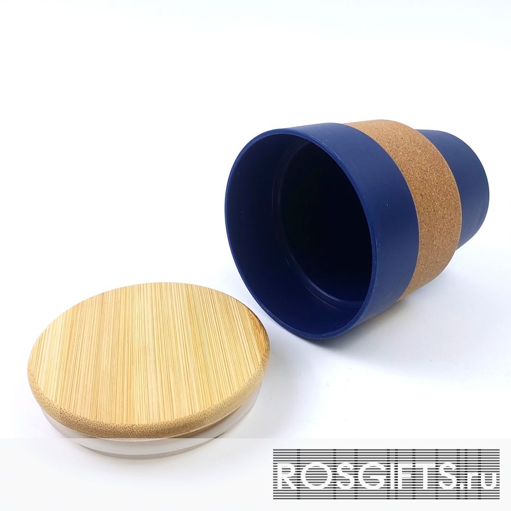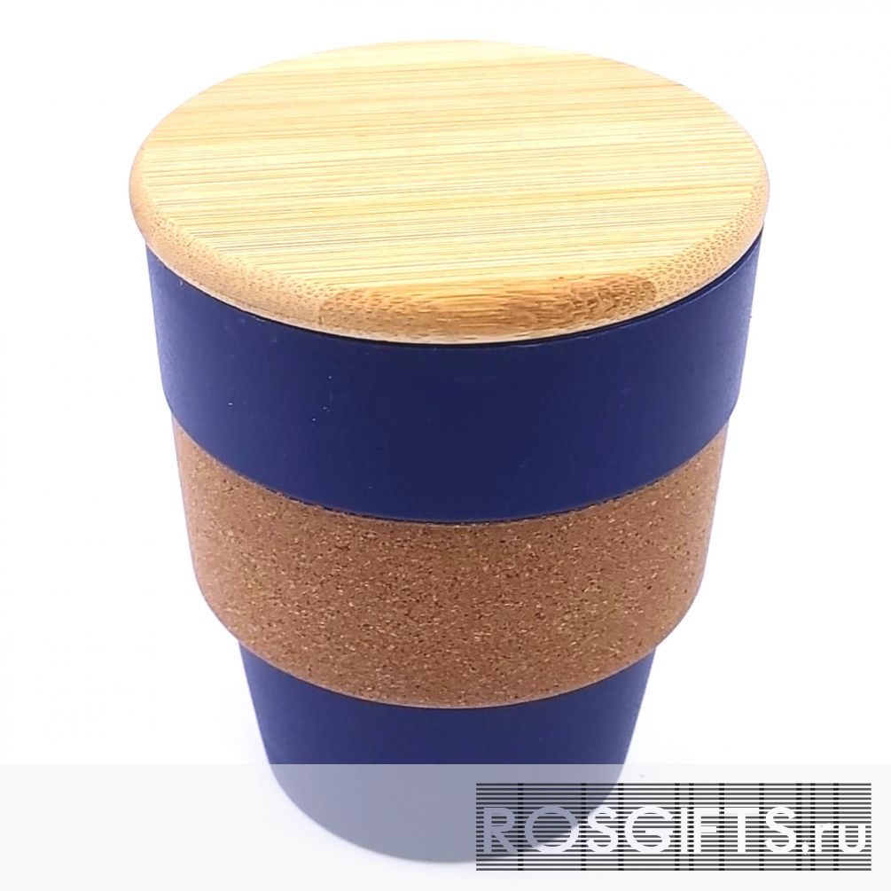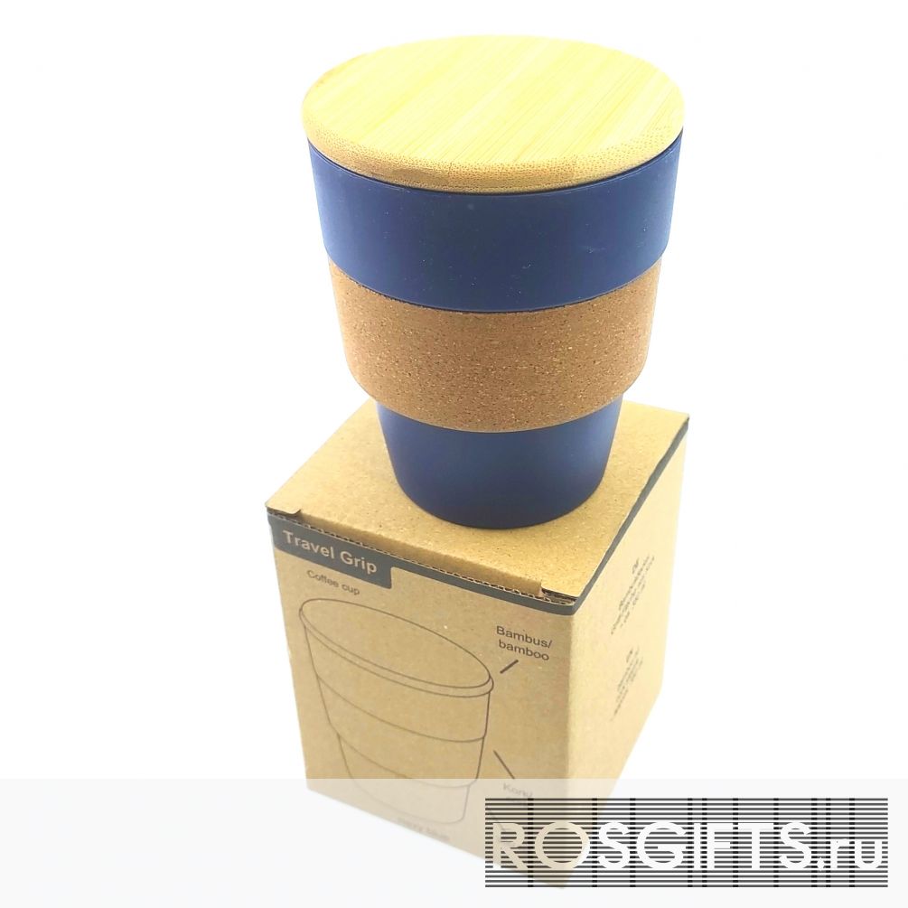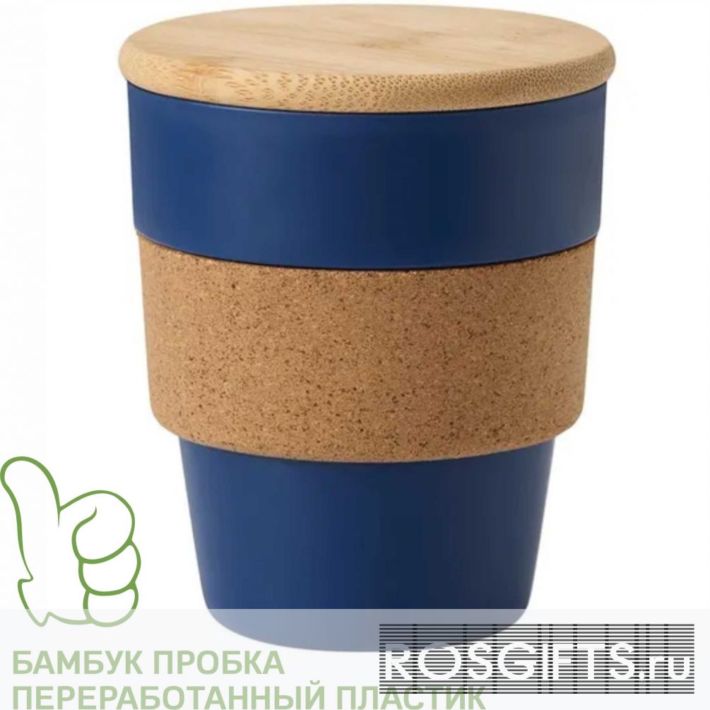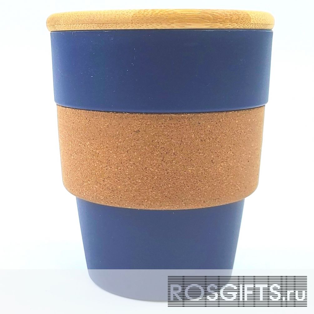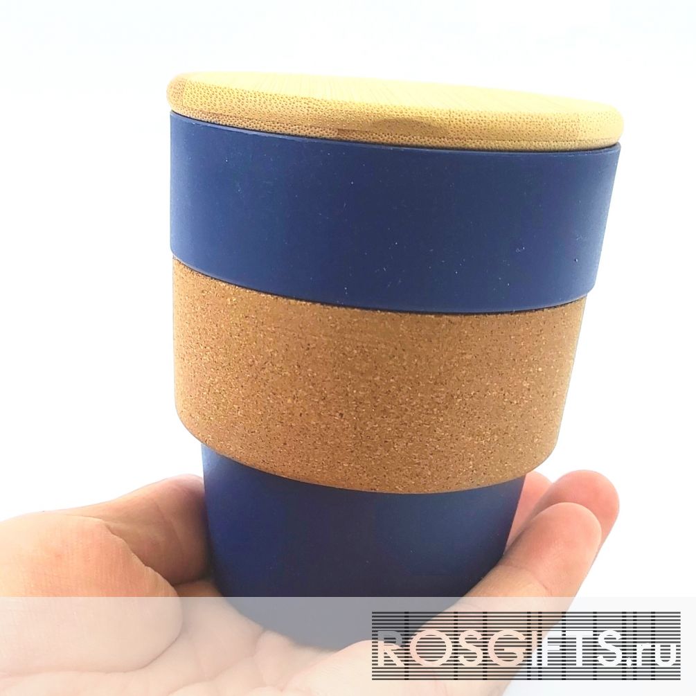 Эко стакан для напитков изготовлен из переработанного пластика, манжета из пробкового дерева, съёмная бамбуковая крышка с силиконовым уплотнительным кольцом, объем около 350 мл.