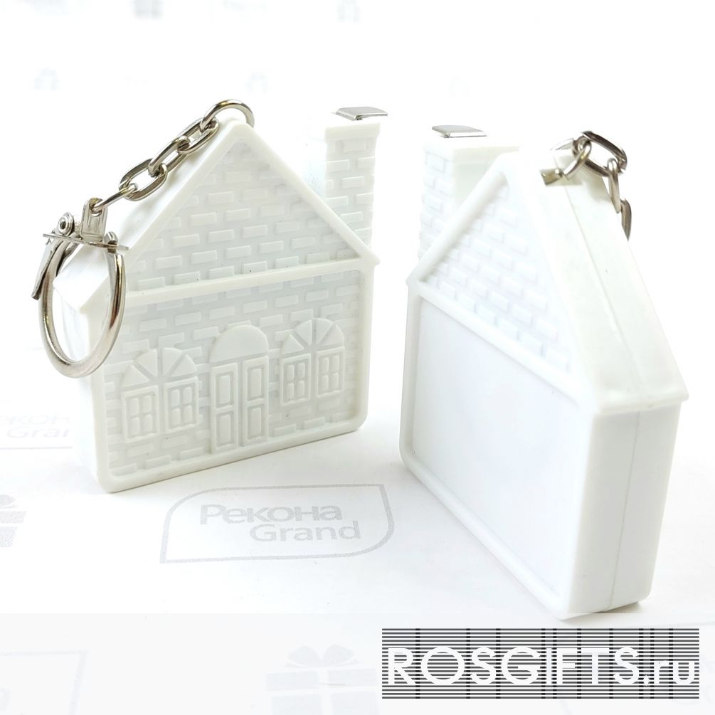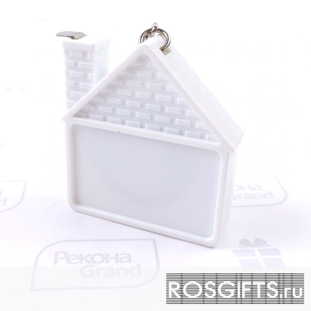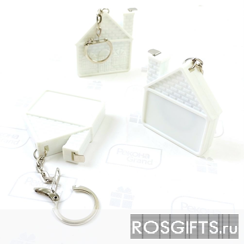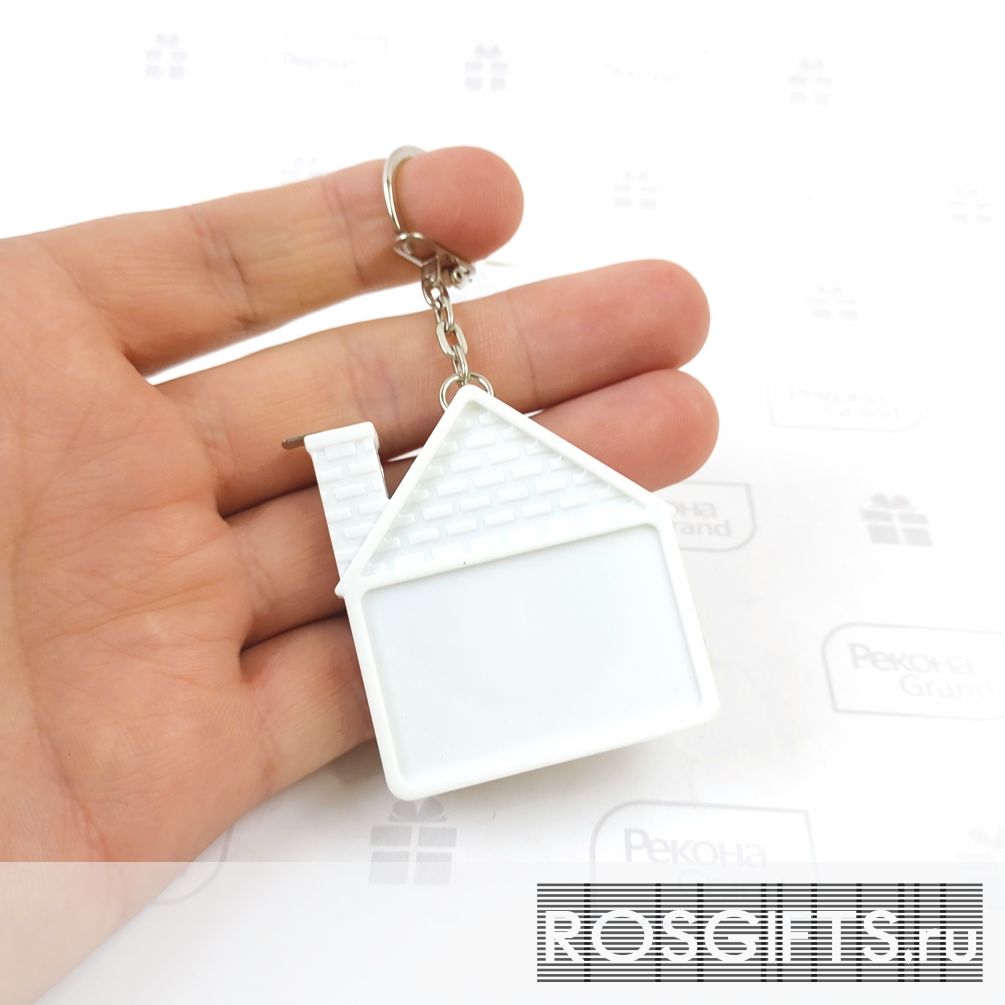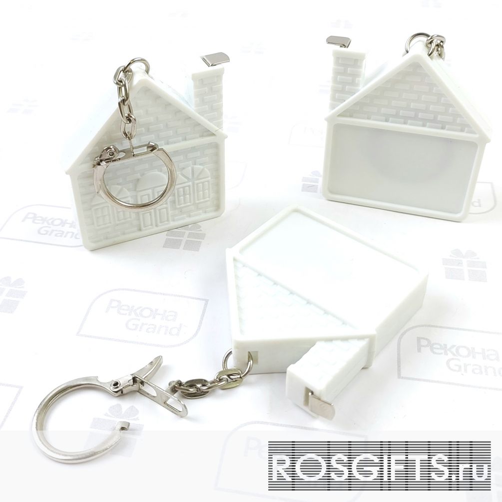 Брелок-рулетка длинной 1 метр в форме домика. Корпус изготовлен из пластика белого цвета. Нанесение можно сделать на обратной стороне.