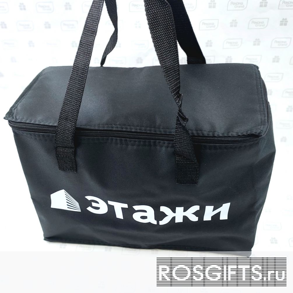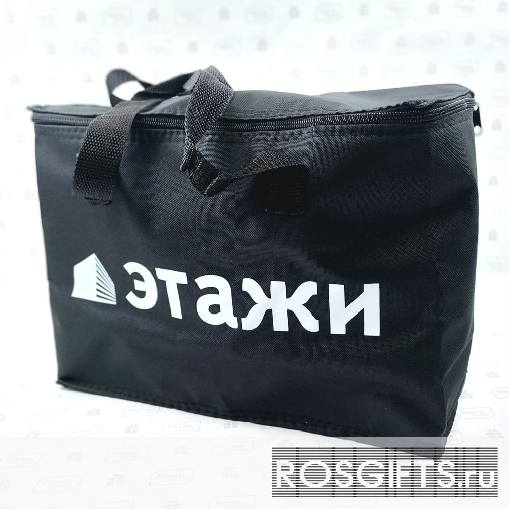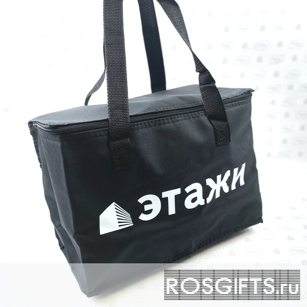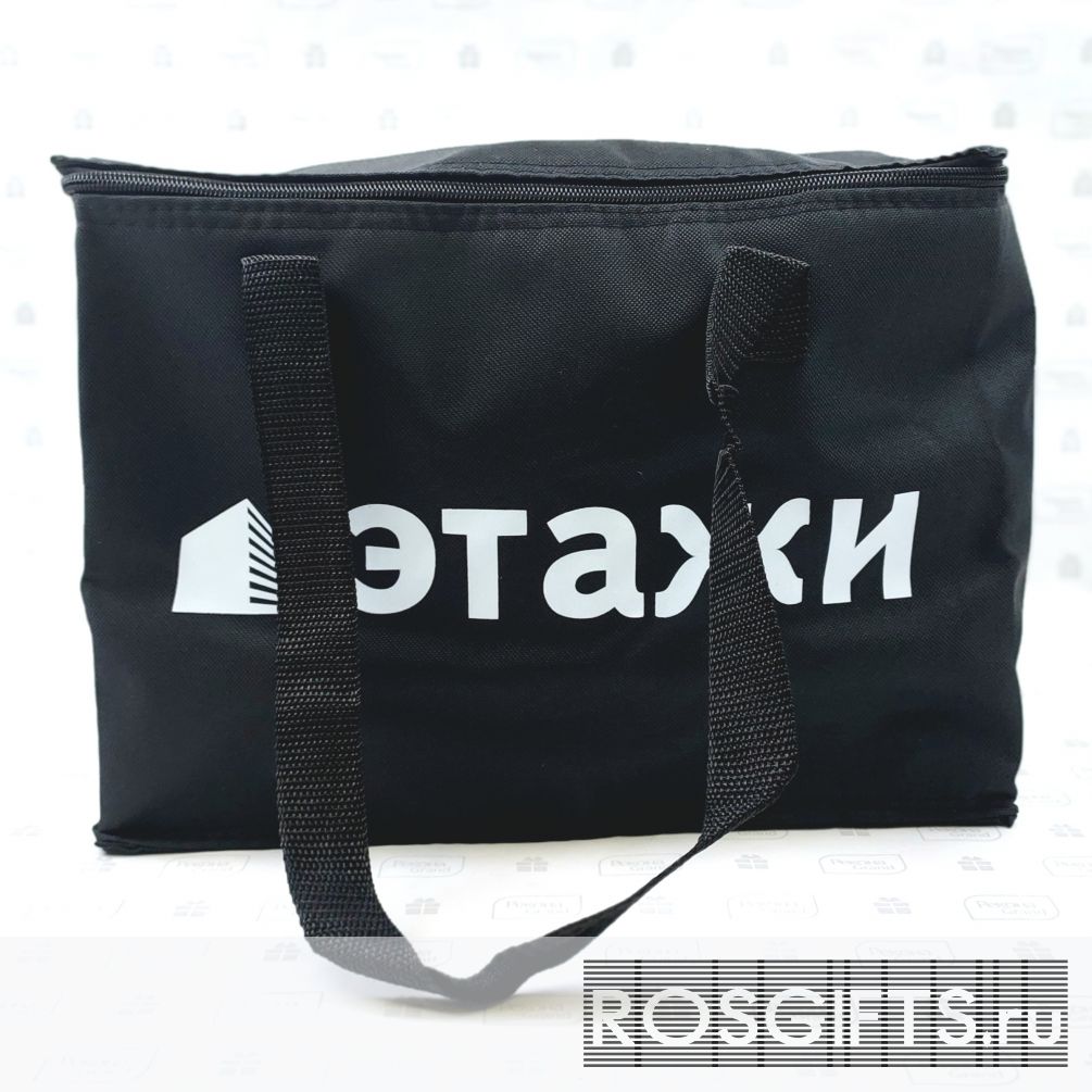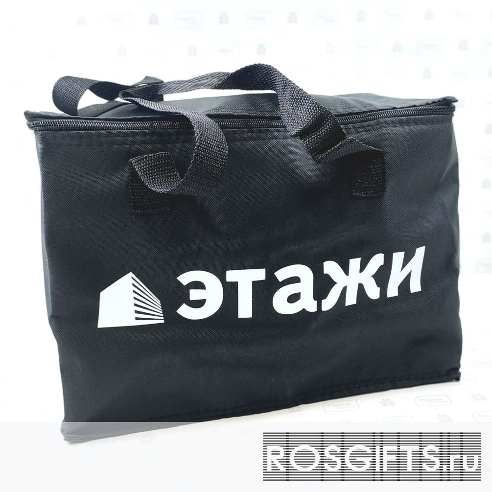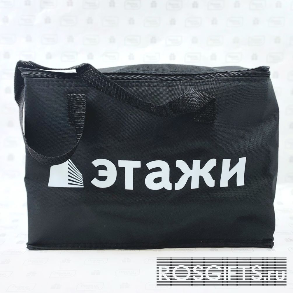 В составе комплексного заказа на изготовление сувенирной продукции в Москве, мы сделали термо-сумки с логотипом агентства ЭТАЖИ со способом нанесения трансфер.